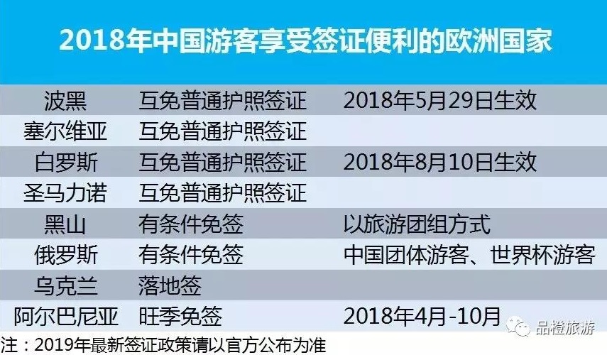 签证方面,2018年对中国游客提供入境便利待遇的欧洲国家达8个。阿尔巴尼亚宣布对中国公民实施旅游旺季免签(4到10月)。中国和波黑持普通护照公民互免签证于5月29日正式生效。中国和白罗斯持普通护照公民互免签证于8月10日正式生效。俄罗斯对中国团体游客和参观世界杯的旅游者免签。黑山对旅行社组团方式的中国游客有条件免签。此前圣马力诺、塞尔维亚已经针对中国游客免签,乌克兰开放落地签。