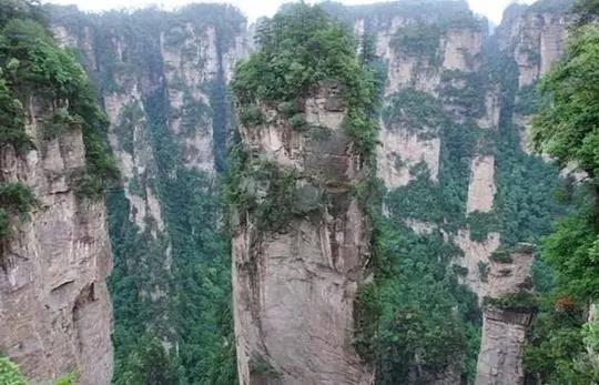山谷中数十座错落有致的秀峰突起,遥冲蓝天,靠右的石峰像倒插的御笔,靠左的石峰似搁笔的“江山”。它是张家界风景区的标志,不断出现在海内外各种媒体和宣传品上面,堪称天下一绝。三座石峰,高低不一,峰顶长有松树,极象几枝倒插的毛笔。日照霞染生辉,云雾涌动时隐时现,精致绝美。