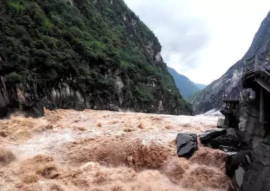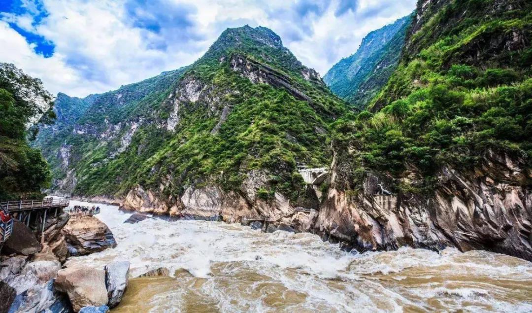 而香格里拉段的虎跳崖,为香格里拉的绝美风光添上了一道不同的色彩——惊险刺激、雄奇险峻。金山江千里迢迢奔腾至此,山高谷深,江水汹涌澎湃。虎跳峡一向以“险”而闻名天下。这里首先是山险。峡谷两岸,高山耸峙。东有玉龙雪山,终年披云戴雪,银峰插天,主峰海拔高达5596米,山腰怪石镲峨,古藤盘结,山脚壁立,直插江底,虎啸猿啼,狼豹出没;西有哈巴雪山,峥嵘突冗,山腰间有台地,山脚为陡峻悬崖。西岸山峰,高出江面3000米以上。但虎跳崖的“险”中却蕴藏着一种美,一种摄人心魄的壮美。