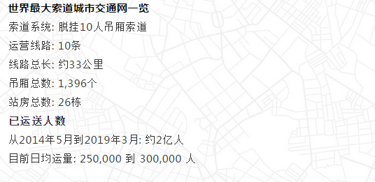 这个南美洲的城市索道网由十条线路组成,总长度近33公里。自2014年5月开通第一条线路以来,截至2019年3月,已运送近2亿名乘客。每天,约有30万人使用MiTeleférico作为上班、购物、上学或休闲的方式。索道非常受游客欢迎,并被猫途鹰(Tripadvisor)推荐为必去景点。