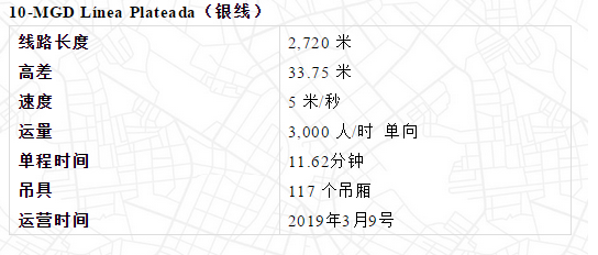 这条现代化的十人吊厢索道每小时单方向可以运送3,000名乘客。新索道经过中间站FaroMurillo-这是该索道网中最大的站房建筑,总面积为10,000㎡。在这里,乘客可以换乘2018年9月营业的LíneaMorada(紫线)。