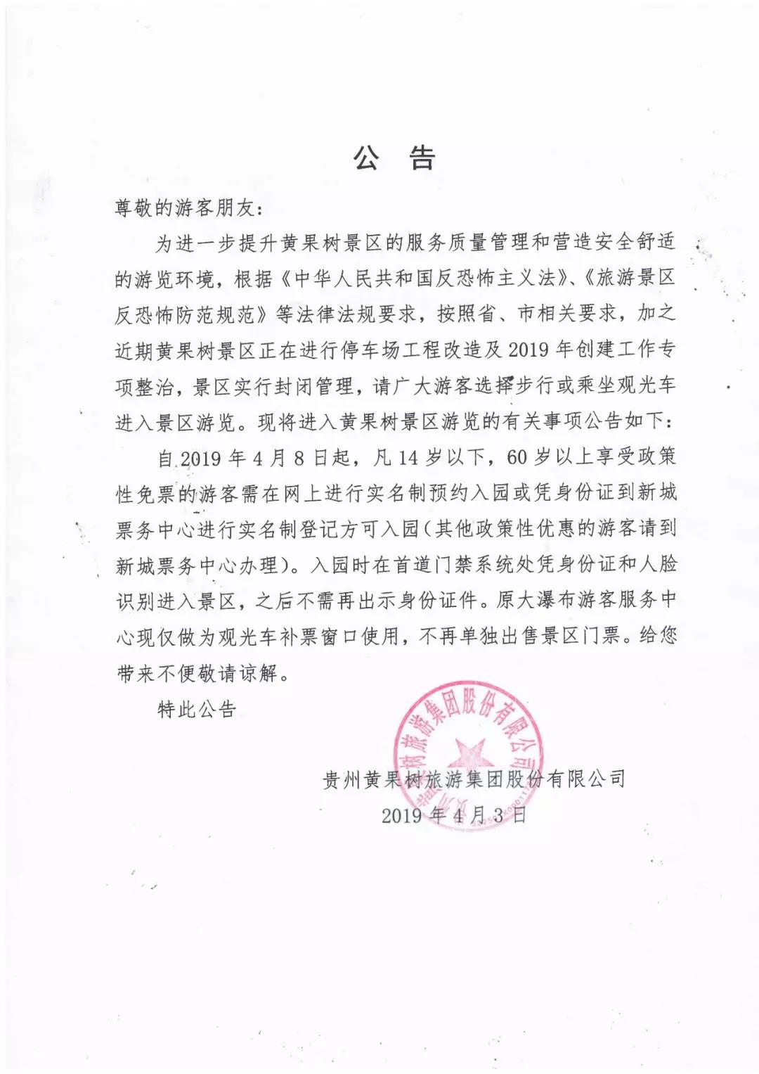 为进一步提升黄果树景区的服务质量管理和营造安全舒适的游览环境,根据《中华人民共和国反恐怖主义法》、《旅游景区反恐怖防范规范》等法律法规要求,按照省、市相关要求,加之近期黄果树景区正在进行停车场工程改造及2019年创建工作专项整治,景区实行封闭管理,请广大游客选择步行或乘坐观光车进入景区游览。现将进入黄果树景区游览的有关事项公告如下:
