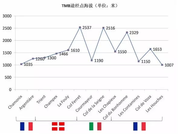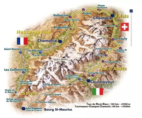途经路线:Chamonix - Argentière - Trient - Champex Lac - La Fouly - Col Ferret - Courmayeur - Col de la Seigne - Col du Bonhomme - Les Contamines - Col de Voza - Les Houches - Chamonix