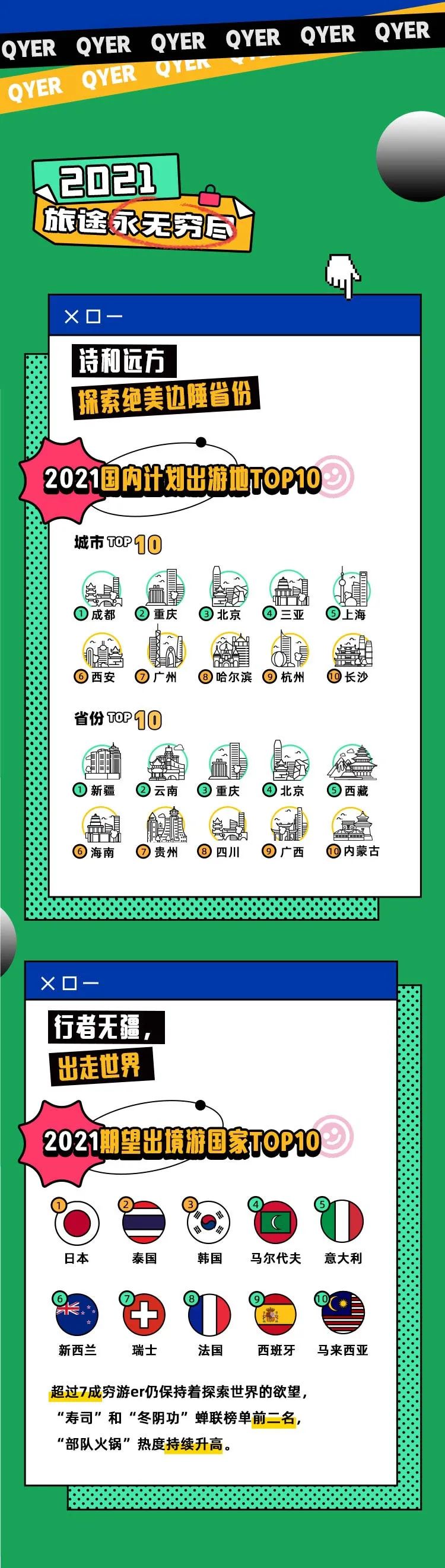 对于新一年的国内出游计划,穷游网用户更愿意探索边陲省份。从2021国内计划出游地排名来看,有着草原、雪山、沙漠等多种地貌的新疆、少数民族聚居的云南、笼罩着神秘宗教色彩的西藏,位列计划出行省份第一、第二、第四名。同时,美食、美景对于用户吸引力仍然巨大,成都、广州、长沙等城市都在他们的打卡计划中。