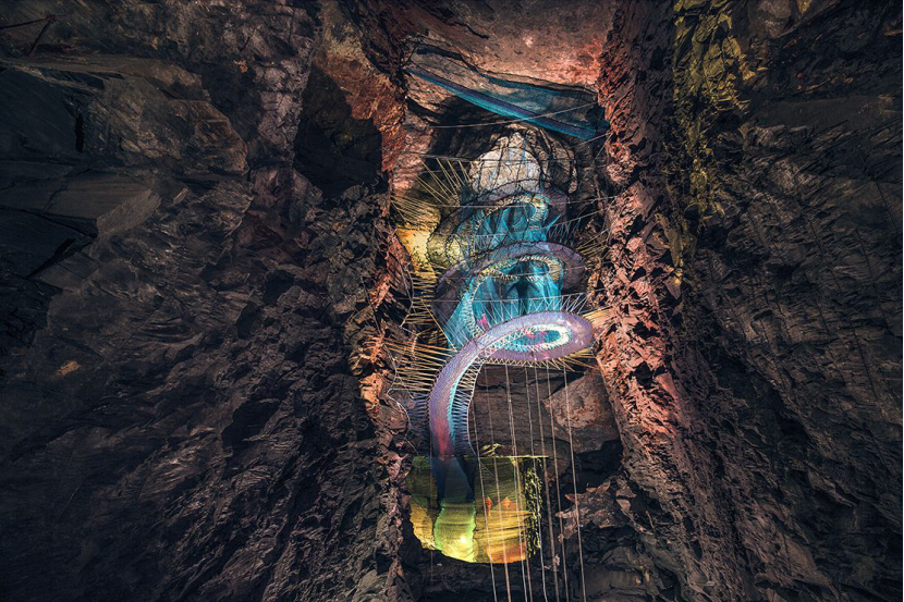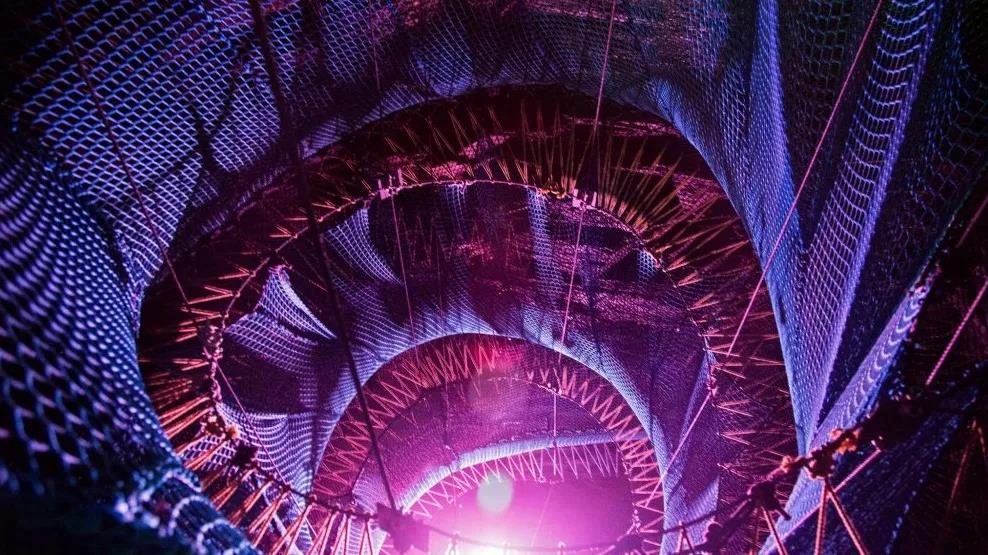 在溜索项目不远处的矿洞深处,藏着一个常人难以想象的户外世界,这里就是北威尔士热门网红项目Bounce Below地下蹦床。55米深的矿洞中重叠着三层巨网,巨网由滑梯、隧道和走道连接,五彩的灯光在网上映射出美丽的渐变,使整个矿洞极富科幻感。