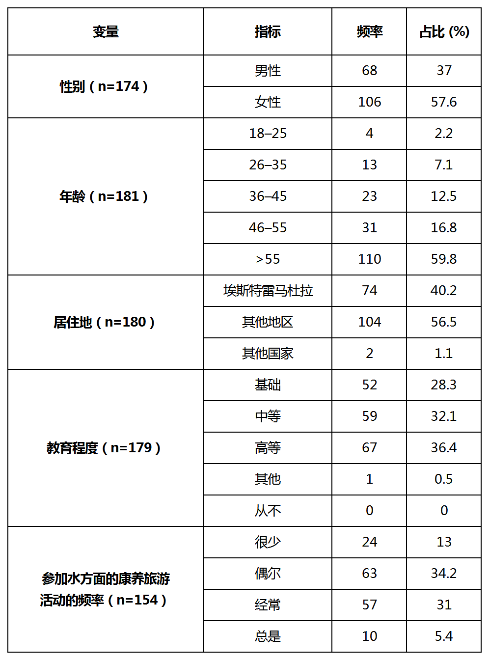 样本构成为37.0%的男性和57.6%的女性。这些前往该地区spa的游客中56.7%来自西班牙其他地区,中等年龄(59.8%超过55岁),教育水平较高(36.4%)。