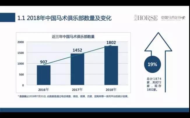 根据《2018年中国马术行业发展状况调查报告》的调查数据,截至2018年7月底全国马术俱乐部共计1802家,大部分的马术俱乐部对未来的发展持乐观态度,并相信这个行业会持续发展。