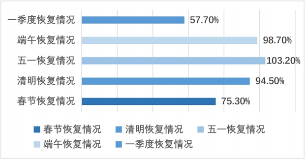 出游距离、停留时长和游憩半径较去年同期扩张明显。春节游客平均出游时长为1.64天,过夜率为29.7%,平均出游半径133.9公里,目的地平均游憩半径为7.6公里。3月以来,消费趋于刚性的商务市场率先恢复,清明、五一期间居民出游半径、停留时长、目的地游憩半径扩张明显,游客平均出游半径分别为172.5公里和149.2公里,目的地平均游憩半径分别为12.3公里和15.2公里。劳动节期间游客平均出游时长2.1天,过夜率达32.6%,较清明假期高4.2个百分点,团队旅游和跨省旅游复苏强劲,调查显示,游客选择省内跨市游比重为47%,跨省游为30.7%。