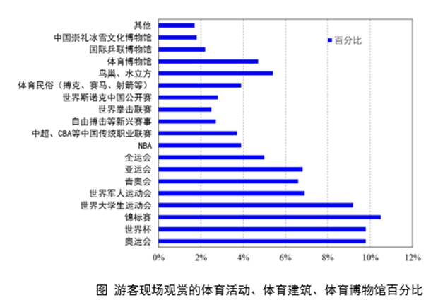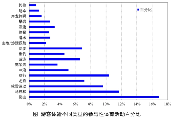 体育旅游以参与型(62.8%)为主,观赏型(37.2%)为辅。在参与型的体育旅游项目中,爬山、马拉松、骑行、冰雪运动、徒步等是大众参与较为广泛的活动;而在诸多的观赏型体育活动中,奥运会、世界杯、世锦赛等世界综合性体育赛事以及水立方、鸟巢等知名度较高的体育建筑受到了消费者的广泛关注。
