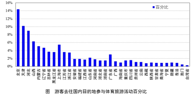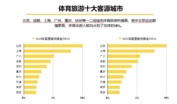 广东以绝对优势占据客源地榜首。广东人民的体育旅游意愿强烈,占了整体的15%。北京和上海分列第二、第三;杭州等一二线城市体育旅游热情高,其中北京运动激情更高,体育出游人数均占到了总体的10%。
