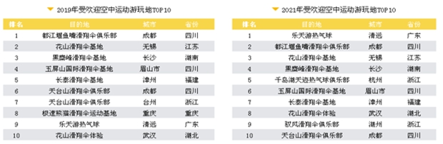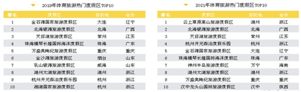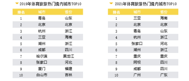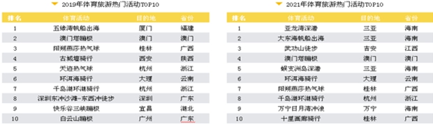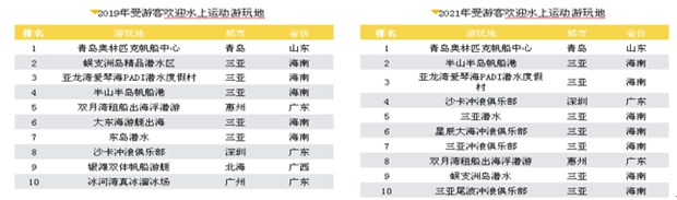 多元化体育旅游品牌满足游客高品质生活需要。根据热门游玩地及其所属目的地数据显示,2019年和2021年水上运动目的地青岛帆船中心居于榜首,随着帆船、冲浪运动热度上涨,2021年三亚帆船港跃居第二,排名前十位中,冲浪俱乐部占据四位。山东、海南、广东等省份的滨海城市一直是水上运动的热门目的地。随着潜水运动的普及,越来越多的游客被深潜、浮潜、自由浅、潜水考证、水下拍照等不同体验吸引,使三亚作为水上运动目的地首选城市,整体热度稳居第一。