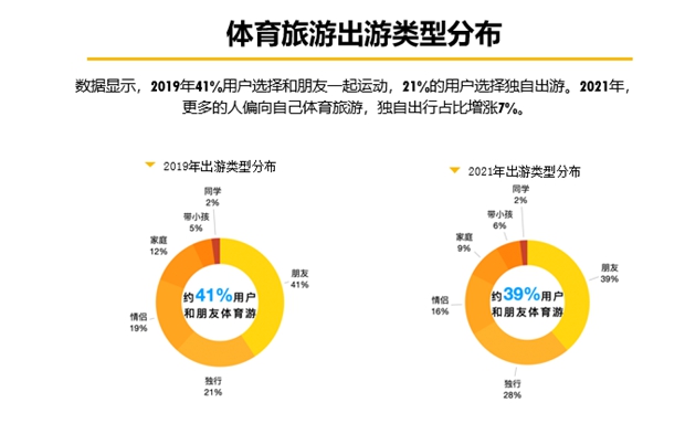 组团出游占比高,运动社交成主流。数据显示,出游结伴类型方面,独自出游、朋友组团、同学结伴旅游的人群更青睐体育旅游,总占比达69%,和朋友及同学出行总占比达41%,独自出行占比28%。“运动+社交”已成当下年轻人的潮流。比如一站式社交运动娱乐场所,网红打卡地“潮玩运动街区”。街区中包含VR、保龄球、棒球、台球、射箭、壁球、复古溜冰、密室、F1赛车模拟器、街机跳舞机、气步枪模拟射击、冰壶、攻防箭、真人镭射战场等,同时提供美食、酒水、表演、赛事直播等内容,通过运动休闲促进社交的模式,已经展现出消费潜力。适合朋友聚会、体验没尝试过的运动很有意思、F1赛车体验感强、有专业教练现场教学等因素是吸引年轻游客的重要原因。也是不少游客认为团队运动可以让他们很容易交上朋友,增进感情。