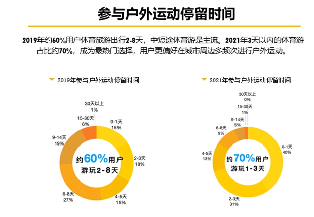 周边短途旅游更受欢迎,周末受青睐。2019年约60%用户选择体育旅游出行2-8天,中短途体育游是主流。到2021上半年,3天以内的体育旅游占比约70%,成为热门的选择。用户更偏好在城市周边多频次进行户外运动,户外运动也逐渐成为人们的生活方式。比如北京较火的跑步圣地——北京奥林匹克森林公园,是很多跑团定期举办训练活动的固定场所。很多社会组织、单位等,也会不定期在北京奥林匹克森林公园举办团建、拓展、定向越野、跑步比赛等活动。吸引了很多到北京旅游的跑步爱好者,也想体验一下在城市氧吧中奔跑,打卡网红跑步公园。