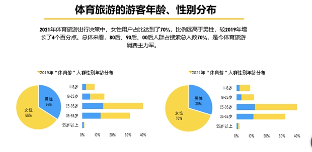 九零后年轻人爱运动,女性在体育旅游决策中占主导。疫情下户外运动花费更加理性,花费下降明显。体育旅游人群中女性占比66%,高于男性,说明在行前攻略、出游决策中女性是主导地位。游客年龄方面,体育旅游年轻化特征显著,80后、90后游客占比超过7成,90后年轻人比重较高,达40%,成为出游的绝对主力。对于有一定经济基础,事业趋于稳定,或拥有自己小家庭的80后、90后人群来说,体育旅游具有相当强的吸引力。