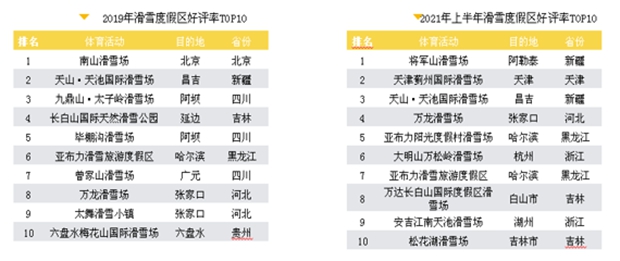 2019年北京南山滑雪场、天池国际滑雪场、太子岭滑雪场、长白山国际天然滑雪公园、毕棚沟滑雪场等滑雪度假区好评率100%。2021年新疆将军山滑雪场好评率100%跃居首位,多数游客认为这里整体设施很棒、雪质好、各种类型的雪道一应俱全、离城区也很近等。天津蓟州国际滑雪场以好评率86%排名第二位,设施多、工作人员负责、有专业陪同教练指导、性价比高等为用户对将军山滑雪场评价的高频词。相比之下,其他滑雪度假区好评率略有下降。