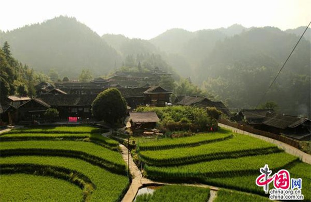 在穿山岩海拔500余米的半山腰处,坐落着一个叫“雁鹅界”的古村落。村子周围山高峰险,林深树密,山泉自流,风景秀美;古村历史悠久,宛如世外桃园。由于其地势较高,坐东朝西,视野开阔,远远望去仿佛在云端之上,所以网友又给它取了个更有诗意的名字:云端古村落。村子里排列着清一色的老木房子,阶梯式排列,飞檐翘角,文脉尚存,古韵犹在;村内古屋古道保存完好,古风古俗沿袭至今。“这个村落是有历史故事的,村里家家户户晒干红辣椒也是有来历的。”村里八十多岁老人贺显厚讲述着雁鹅界的过往。