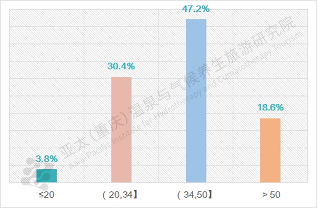 其中,在参与本次问卷调查的年龄结构中,34~50岁(含50岁)的温泉游客占比最大,比例为47.2%。其次为年龄在20~34岁(含34岁)的温泉游客,占比为30.4%。50岁以上的温泉游客数量占比为18.6%。年龄在20岁及以下的温泉游客占比最小,比例仅为3.8%。具体比例如图所示。