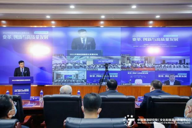 2021中国旅游集团化发展论坛以“变革、创新与高质量发展”为主题,由中国旅游研究院和中国旅游协会主办,采用线上线下相结合方式,在北京、上海、杭州、南京、广州五个城市同步进行。中国旅游研究院院长戴斌主持论坛,文化和旅游部党组成员、副部长杜江出席。