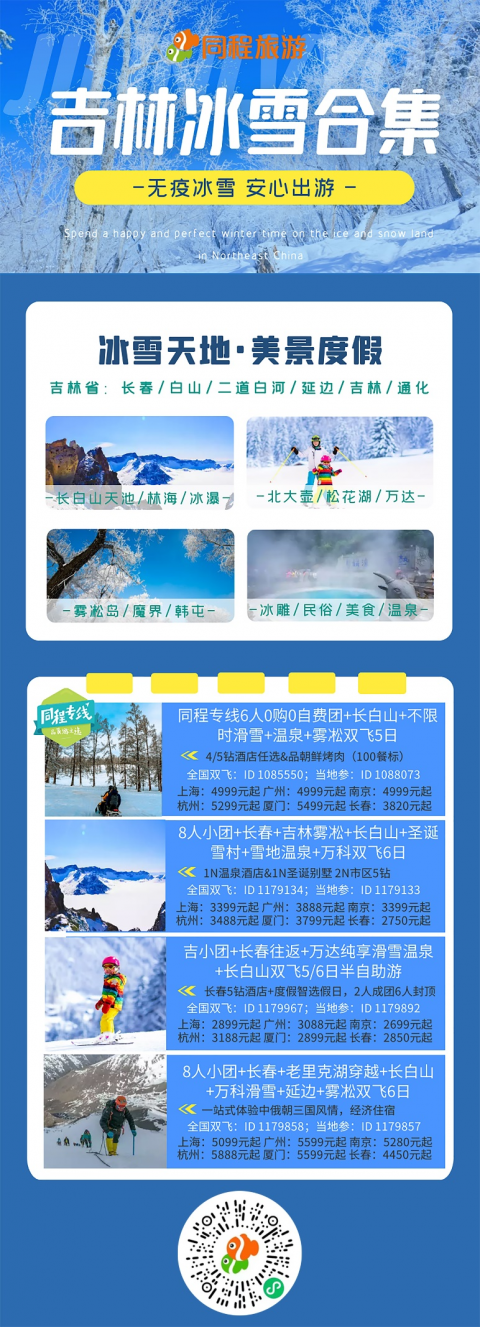 眼下我国北方地区正值冰雪季节,冰雪观光、冰雪运动、冰雪体验等一系列冰雪经济“火热”,同程旅游数据显示,长白山、雾凇岛作为冬季旅游热门目的地,相关搜索量持续增长,不少消费者期待在临近的圣诞与元旦假期前往游玩,“同程专线+长白山+不限时滑雪+汉拿山温泉+雾凇岛双飞5日跟团游”“8人小团+长春冰雪大世界+吉林雾凇+长白山天池+圣诞雪村+雪地温泉+滑雪双飞6日跟团游”“安吉绿地铂骊酒店酒景套餐,江南天池温泉或滑雪/观音堂滑雪/云上草原星空滑雪”“温泉+滑雪套餐+隐居山水酒店套餐2日自由行”等是目前游客关注度较高的冰雪线路。