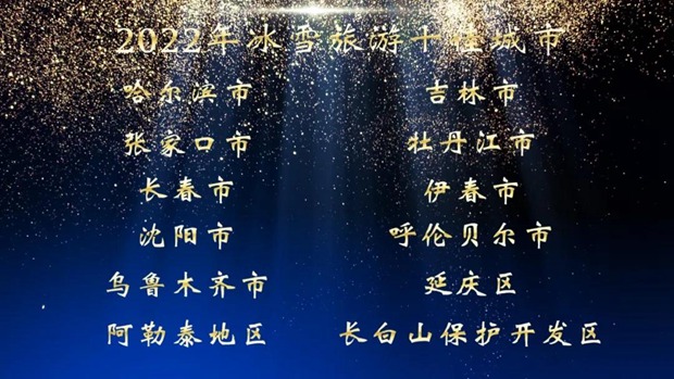 哈尔滨市、张家口市、长春市、沈阳市、乌鲁木齐市、阿勒泰地区、吉林市、牡丹江市、伊春市、呼伦贝尔市、延庆区、长白山保护开发区进入“2022年冰雪旅游十佳城市”名单。