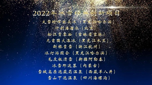 大雪时节采头冰(黑龙江哈尔滨)、什刹海溜冰(北京)、松江赏雾凇(吉林省吉林)、元宵围火滚冰(黑龙江木兰)、断桥赏雪(浙江杭州)、冰灯游园会(黑龙江哈尔滨)、毛皮板滑雪(新疆阿勒泰)、冰雪那达慕(内蒙古)、雪域高原泡藏药温泉(西藏羊八井)、雪山下泡温泉(四川海螺沟)进入“2022年冰雪经典创新项目”名单。