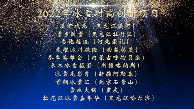 漠河找北(黑龙江漠河)、雪乡跳雪(黑龙江牡丹江)、雪地摇滚(河北崇礼)、米堆冰川探险(西藏林芝)、冬季英雄会(内蒙古呼伦贝尔)、禾木冰雪摄影(新疆喀纳斯)、冰雪光影秀(新疆阿勒泰)、首钢冰雪汇(北京石景山)、雪地火锅(重庆)、松花江冰雪嘉年华(黑龙江哈尔滨)进入“2022年冰雪时尚创新项目”名单。