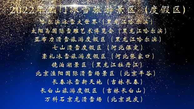 哈尔滨冰雪大世界(黑龙江哈尔滨)、太阳岛国际雪雕艺术博览会(黑龙江哈尔滨)、亚布力滑雪旅游度假区(黑龙江哈尔滨)、七山滑雪度假区(河北保定)、崇礼冰雪旅游度假区(河北张家口)、镜泊湖景区(黑龙江牡丹江)、北京渔阳国际滑雪场景区(北京平谷)、长春冰雪新天地(吉林长春)、长白山旅游度假区(吉林长白山)、万科石京龙滑雪场(北京延庆)进入“2022年热门冰雪旅游景区(度假区)”名单。