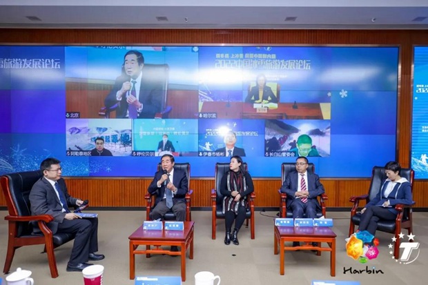 李仲广副院长主持了高端对话环节,北京冬奥会顾问、中国雪橇协会主席、国家体育总局冬季运动中心原主任赵英刚 、伊春市市委常委、副市长杨彬、哈尔滨市文化广电和旅游局局长兰峰、呼伦贝尔市文化旅游广电局局长臧著强、长白山管委会旅游和文化体育局局长耿德勇、阿勒泰地区文化体育广播电视和旅游局局长刘克川、金雪花滑雪产业联盟秘书长、北京静之湖滑雪场总经理徐丽晶、北京市渔阳集团、北京市渔阳滑雪场董事长李伟杰、万科集团酒店和度假事业部COO、万科石京龙滑雪场董事长陆慧、哈尔滨文旅集团董事长贾连琦等嘉宾围绕“冬奥之约与未来世界的中国冰雪旅游”展开研讨。