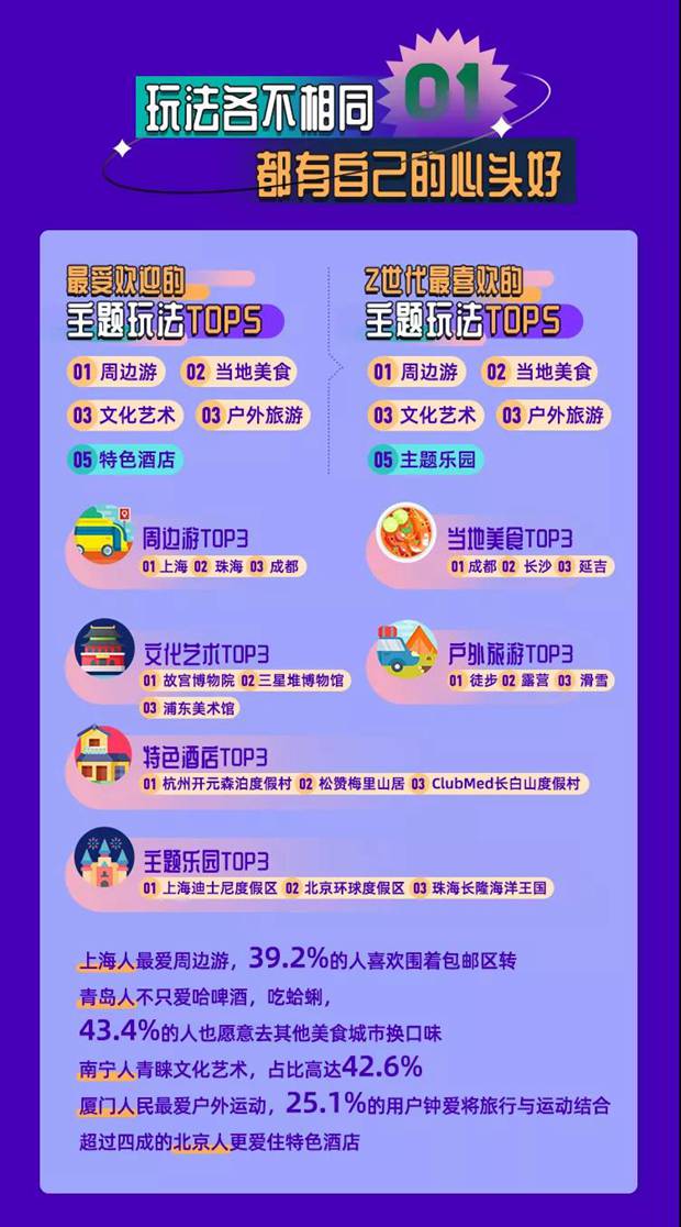 各地区偏爱的旅行主题也千差万别。上海人最爱周边游,39.2%的人喜欢围着“包邮区“转。43.4%的青岛人不只爱“哈啤酒,吃蛤蜊”,也愿意去其他美食城市换口味。南宁人对于文化艺术的热情持续上涨,以42.6%的比例超过天津跃居一位。厦门人则最爱户外运动,25.1%的用户钟爱将旅行与运动结合。而超过四成的北京人更爱住特色酒店。