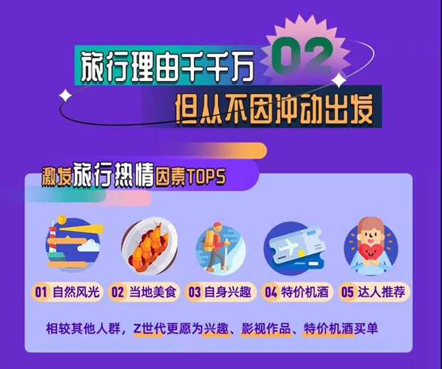 开启一趟旅行的理由很多,但穷游网用户从不因冲动出发。目的地独有美景、当地美食、自身兴趣、特价机酒、达人推荐是激发游客出行的五大主要因素。值得注意的是,相较其他人群,Z世代更愿为兴趣、影视作品、特价机酒买单。过去两年,热门目的地都已玩遍,大家都在挖掘国内小众目的地,而跟随达人推荐更有可能开启未知的旅行新体验。
