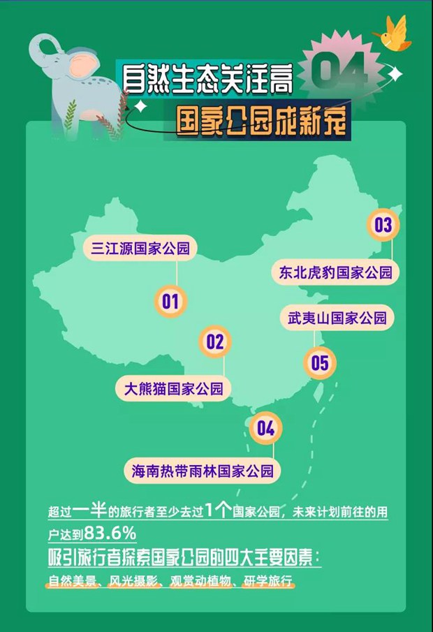 旅行者们对于自然生态的关注度同样很高。去年十月正式公布的第一批国家公园名单,超过一半的穷游用户至少去过其中的1个,83.6%的用户未来计划前往。自然美景、风光摄影、观赏动植物、研学旅行成为吸引旅行者们探索国家公园的四大主要因素。