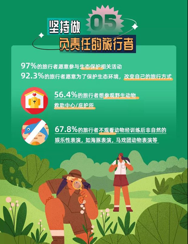 随着穷游网对“负责任的旅行”的持续倡导,更多穷游er践行了负责任的理念。97%的用户愿意参与生态保护相关活动,92.3%的旅行者甚至愿意为了保护生态环境,改变自己的旅行方式。在旅行时,56.4%的用户想参观野生动物救助中心/庇护所。同时,67.8%的旅行者不观看动物经训练后非自然的娱乐性表演,如海豚表演,马戏团动物表演等。