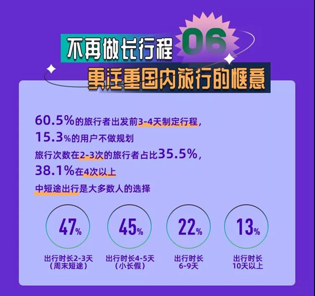 说走就走的国内旅行,让越来越多的穷游网用户不再规划长行程。数据显示,60.5%的旅行者出发前3-4天才制定行程,更有15.3%的用户不做行程规划。受各地疫情、暴雨等影响,2021年旅行者的旅行次数有所降低,但仍有38.1%的旅行者一年出行4次以上,且以中短途旅行为主。