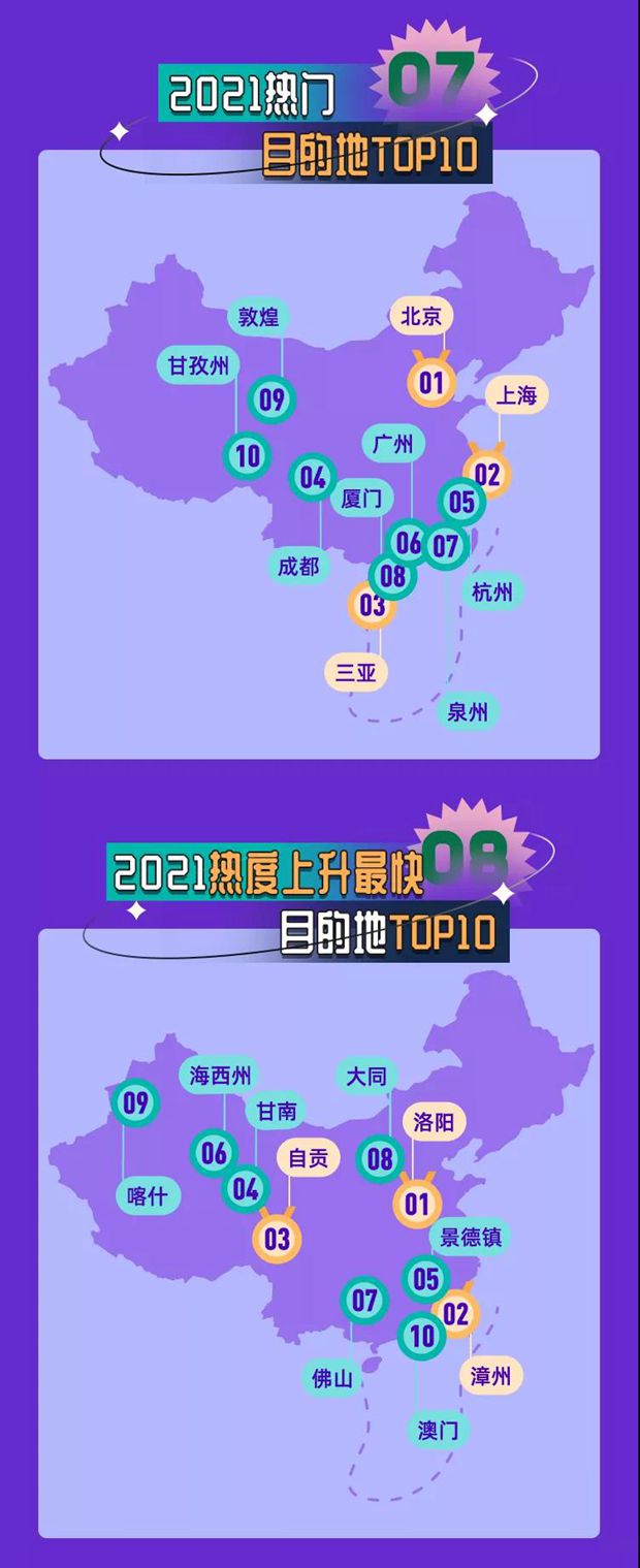 年度十大热门目的地中,北京、上海、三亚位居前三,同时又一批城市正在成为穷游用户的新选择。“半城烟火半城仙”泉州、“海上花园”厦门、“文化圣殿”敦煌、“丁真故乡”甘孜州首次上榜。而热度上升最快的目的地中,十三朝古都洛阳位列第一,“土楼王国”漳州紧随其后,自贡凭借中华彩灯大世界被人熟知,坐拥中国火星模拟基地的海西州同样吸引了人们的目光,佛山则以“朴素外表”的机场频繁出圈。