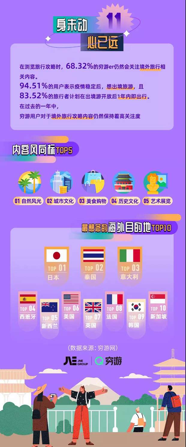 在浏览境外旅行内容时,更多用户开始关注户外生态景色。自然风光主题跃居第一,文化、历史、艺术等相关内容提升幅度较大。而对于境外游开放后最期望去往的海外目的地,日本、泰国、意大利、西班牙、新西兰、美国、英国、法国、韩国、新加坡分列前十。