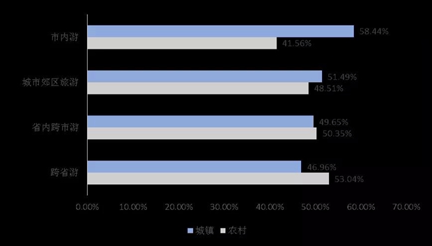 “非必要不出行”带动“本地人游本地”,旅游市场近程化特征明显。受疫情影响,多地发布非不要不离省(市)等从严从紧通知,“就地过节”促使居民出行范围(图3)以短途、近郊、省内游为主,专项调查结果显示,元旦假期跨省游比重较去年同期略有下降,省内跨市游比重有所增加,提升了4.9个百分点。城镇居民普遍选择省内、市内及城市周边近郊游,农村居民跨省游比重反而高于城镇居民(图4),此类现象可能和政策的普及程度相关。