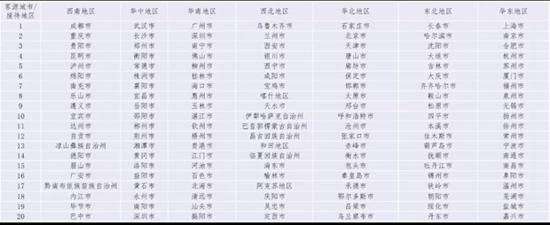 旅游市场区域内循环作用突出,省域、市域间的联动效应仍然明显。从区域接待视角分别分析其客源地省份和城市的分布情况(表1),可以看出,各地区承接跨省游游客主要以区域内的省域游客为主,分布相对集中,其中,华东和西北地区表现较明显。从客源城市上看(表2),区域接待客源城市的分布较省域表现出深一层次的递进,省域城市之间的联动性较强。游客在区域内相邻省域、市域流动性较大,区域内循环表现仍然突出。其中,西南地区省域内循环明显,客源城市前20位中7成来自四川省;华中、华南地区客源城市分布相对较平均,分别集中在湖南、湖北、广西和广东四省;西北、东北、华北和华东地区则表现为区域内循环,客源城市分布相对较丰富。