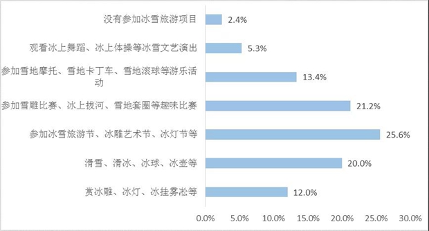 冬奥效应让冰雪休闲市场加速释放,文化休闲成为假期旅游新风尚。文化冬奥会举办在即,冰雪为主体的本地游、周边游持续升温,城乡居民的冰雪旅游、冰雪休闲、温泉体验在一些地区的热度上升。长白山、张家口等传统冰雪旅游风景区热度走高,各地积极探索将冰雪旅游融入夜经济,增强夜间休闲对游客的吸引力,丰富冬季旅游休闲生活。调查结果显示(图13),调查者中仅2.4%的游客未参与冰雪休闲类活动,其中,冰雪旅游节、冰雕艺术节、冰灯节的参与度最高,滑雪、雪橇、冰球、冰壶等各种冰雪类体育运动也深受游客喜爱。冰雪休闲旅游正从小众市场向大众休闲转变。综合多方数据显示,假日期间,城市周边雪场表现较好,如,武汉神农架滑雪场三天接待游客超过2万人次,贵州梅花山滑雪场和玉舍滑雪场累计接待游客1.86万人次,同比增长21.50%,吉林北大湖滑雪场共接待旅游人数2.6万人次,同比增长10%,新疆各滑雪场共接待旅游人数2.72万人次。冰雪运动在满足人民对冰雪体验的向往同时也促进了当地旅游消费。