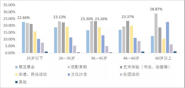 文化休闲同样为元旦假日旅游增添一抹亮色,从供给侧看,各地积极依托城市旅游休闲街区、文旅消费集聚区创新假日文旅产品供给。南京博物院、南通文化馆、大钟寺古钟博物馆、济宁图书馆等打造跨年线上展,带领群众“文化跨年”;上海、安吉、西来古镇、普洱等地推出非遗文化集市,打造“文创+非遗”新场景。非遗研学游、民俗文化游、家庭亲子游产品备受游客喜爱,蕴含国潮的文化跨年方式更受年轻游客欢迎,旅游消费也向年轻化趋势转变。需求侧数据显示,元旦假日,超过83%的游客参与了两项及以上的文化游览活动,73%的游客参与文化活动时间在2小时以上,超半数游客参与博物馆、图书馆等公共文化场馆及文化街区的休闲体验。从年龄分布上来看9(图14),25岁以下游客热衷展览展会,26-45岁及60岁以上游客喜爱观影赏剧,46-60岁游客对参与艺术体验的兴趣浓厚。