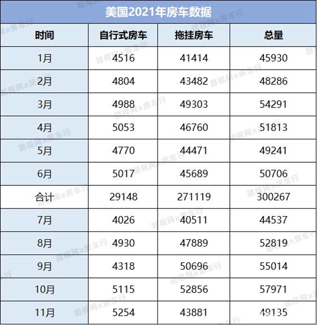 2021年美国房车增速迅猛,前十一个月房车总销量为559743辆,相较2020年前十一月的389943辆,同比增长43.5%。其中,自行式房车总销量达到52791辆,相较于2020年前十一月的36825辆,同比增长43.4%;拖挂房车总销量为506952辆,相较于2021年前十一月的353109辆,同比增长43.6%。