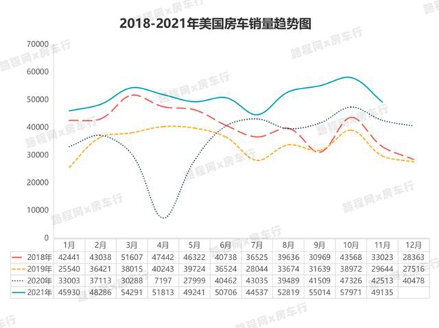 2021年12月初,美国房车工业协会(RVIA)总裁兼首席执行官雷格·柯比(Craig Kirby)表示:“2021年房车制造商和供应商已经取得前所未有的成就,根据前十一月房车出货量趋势判断,预计2021年年底房车销量将在593600~610800辆之间,最有可能在年底达到602200辆,与2020年的430412辆相比增长近40%。” 而根据前十一月房车销量增长数据来看,预测全年实现40%增长率的可能性非常高。