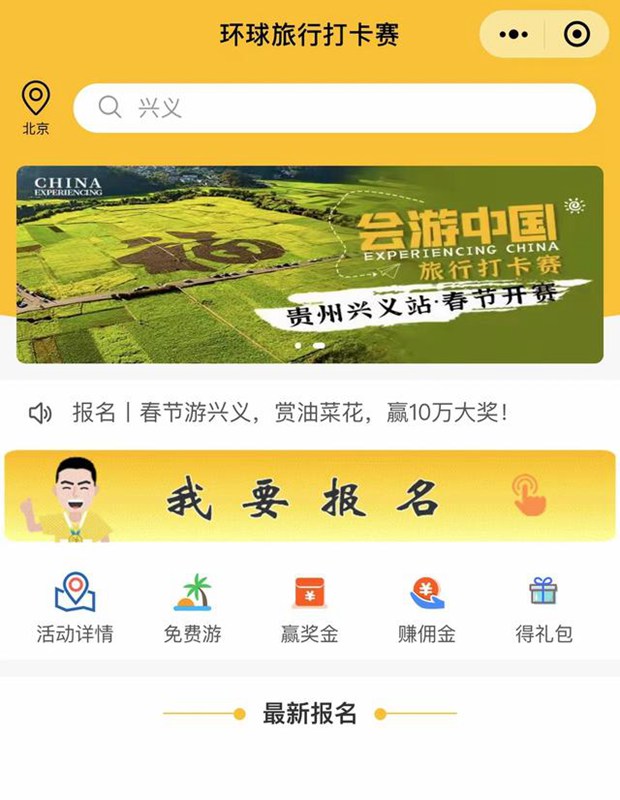 “比赛共设置了26个打卡点,时间为2022年2月1日至2月28日,并对获奖者给予现金奖励,在微信小程序中搜索‘旅行打卡赛’,就可以报名了。”据兴义市万峰林黔龙户外运动管理有限公司副总经理母桐介绍,该项活动是“环中国自驾游集结赛”推出的网络赛事活动,将邀请所有游客通过兴义、义龙各景区景点设置的26个指定点,进行游玩、拍照、打卡、并上传到网络平台的方式,秀出最美的风景,即可获得相应积分,系统将对在线积分进行自动排名。参赛选手可随时于小程序内查看积分、排名,最终获奖名单也将在平台进行公布。