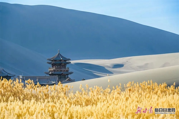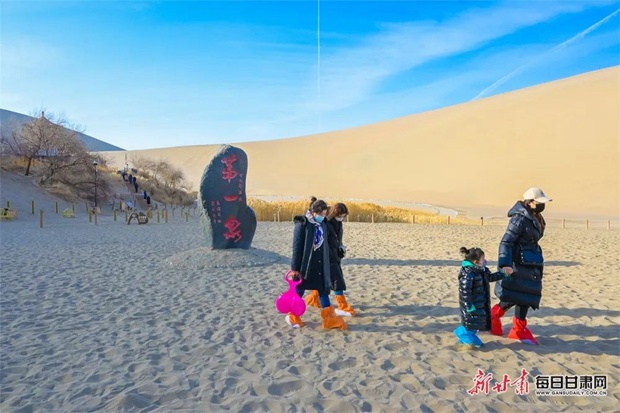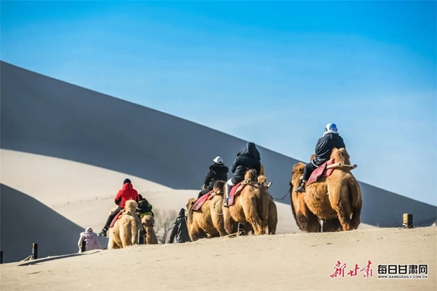 虎年春节假期,甘肃敦煌各大旅游景区正常对外开放,四面八方的游客前来观光游览。在敦煌鸣沙山月牙泉国家5A级旅游景区,冬日暖阳下的鸣沙山开阔宁静,天空晴朗,有片片白云飘过,给人心旷神怡的独特感觉。游客在经过扫码、测量体温、登记等疫情防控措施流程之后,进入鸣沙山月牙泉景区,骑骆驼畅游鸣沙山,体验敦煌新春伊始的丝路风情、大漠风光。