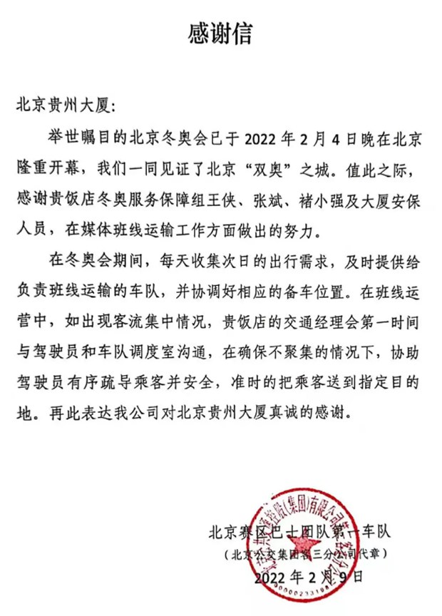 2月9日,北京贵州大厦收到2022年北京冬奥会北京赛区巴士团队第一车队发来的感谢信,信中对大厦冬奥交通服务保障组及大厦安保人员在媒体班线运输工作方面所做的工作和努力表达了感谢。