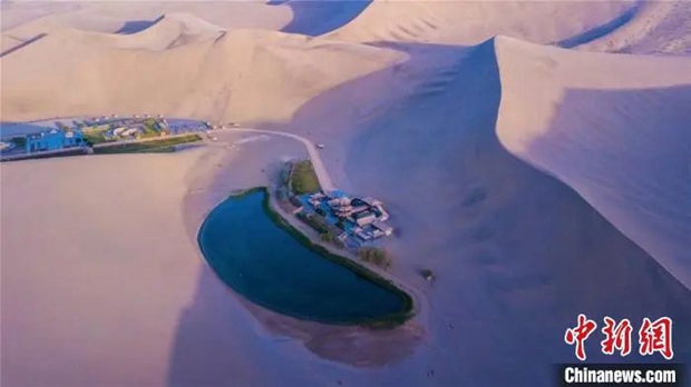 今年四月以来,敦煌气候温润,雨水较多,鸣沙山月牙泉景区草木葱茏,月牙泉水位持续上升。