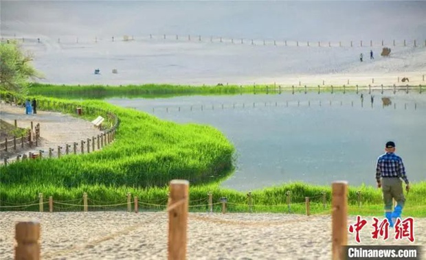 今年四月以来,甘肃敦煌气候温润,雨水较多,鸣沙山月牙泉景区草木葱茏,月牙泉水位持续上升,水域面积逐渐扩大,泉水已渗出月牙泉围栏之外近1米的距离。据悉,3年前月牙泉泉水一直保持在围栏之内。近年来,敦煌市牢固树立“绿水青山就是金山银山”的发展理念,大规模开展绿化和防沙治沙行动,不断强化节水措施,生态环境建设取得明显成效。
