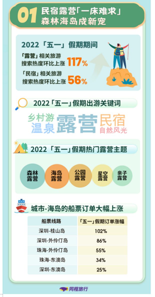 2022年“五一”假期,由于国内部分地区疫情反复,中国旅游出行市场呈现出全新发展趋势。5月4日,同程旅行发布《2022“五一”假期旅行消费数据报告》,显示,露营和民宿市场在假期持续升温。