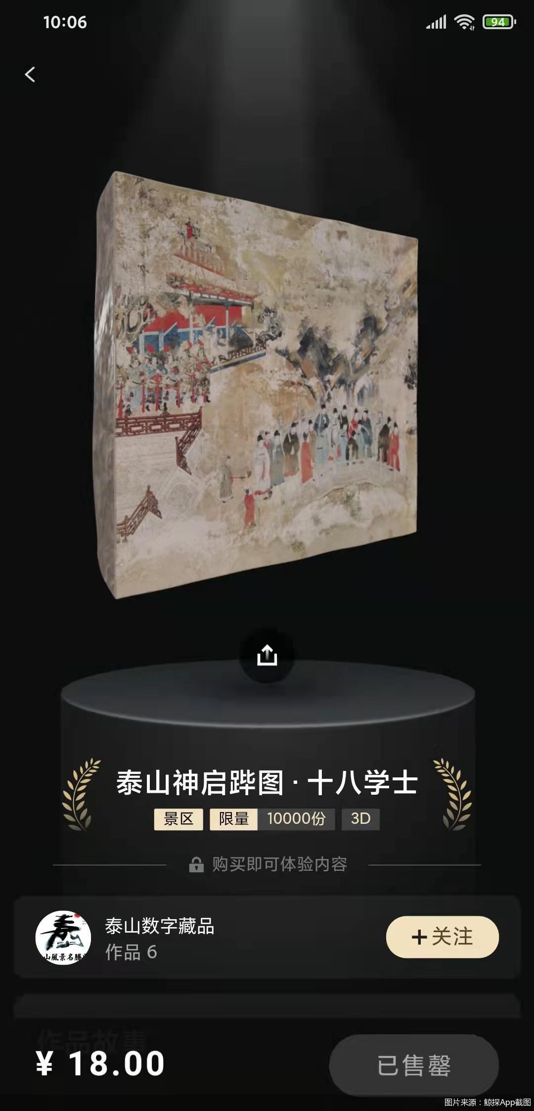 4月27日上午10点,泰山景区推出的“泰山神启跸图·十八学士”和“泰山神启跸图·东岳大帝”正式上线。北京商报记者注意到,此次限量1万份的“泰山神启跸图·十八学士”仅开售6分钟便售罄。