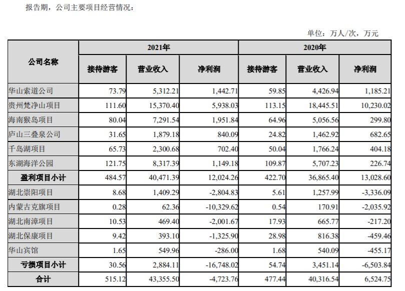 盈利项目中贵州梵净山项目报告期内营业收入和净利润均有所下滑,主要系上年度梵净山旅业公司转让旗下两家子公司,本年度相应减少了景区门票及观光车收入,但报告期内仍保持了游客量的稳定。若剔除上年度转让子公司股权产生的投资收益影响,贵州梵净山项目净利润同比上升50.22%。
