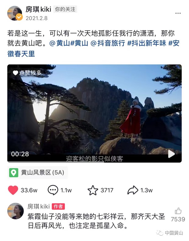 2022年开年至今,旅游业线下几乎只剩下眼前与苟且,好在线上还有诗和远方。 “登黄山,天下无山”,头部旅游达人房琪kiki一则游黄山的视频,为黄山带来超70万的点赞,让出行受阻的游客们在疫情之下也能享受到黄山四千仞、三十二莲峰的壮观。